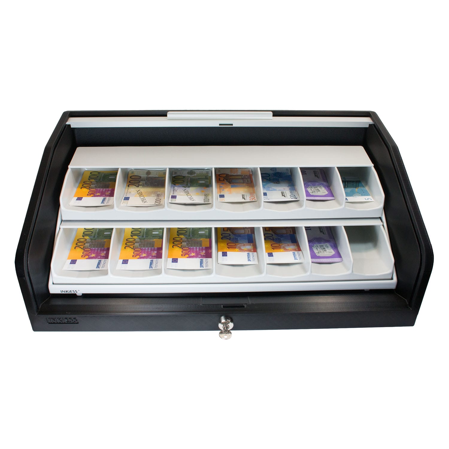 • Perfekter Überblick auf kleinem Raum: Das intelligente 2-Etagen-System staffelt 14 Banknotenfächer übereinander. So haben Sie alle Euro-Scheine (und Fremdwährungen) sortiert im Blick, ohne wertvolle Arbeitsfläche zu verschwenden.