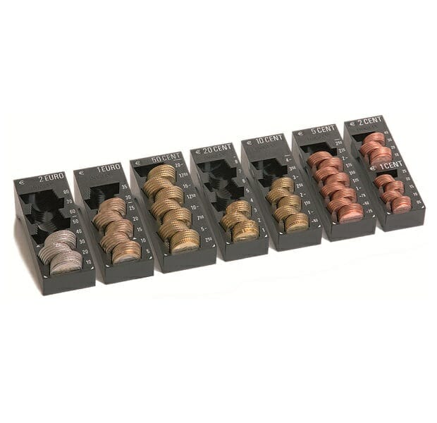 Basiselemente sind die INKiESS MiNiKORD Einzelmünzbehälter, die es für jeden der 8 EURO-Münzwerte gibt. Die vertiefte Aussparung im untersten Münzfach der Einzelmünzbehälter und die gestufte seitliche Gestaltung der Münzfächer verhindert ein Umfallen der Münzen. Ein "denkender Strich" ist der bewährte Rollstrich (rechts). Er zeigt an, bei welchem Betrag eingerollt werden kann. Münzrollen können so leicht hergestellt und neu geöffnete Rollen auf Vollständigkeit überprüft werden. Dazu kommt der "zählende Pfeil". Diese dreieckige Markierung (links) bezeichnet die Stelle, bei der aus einem vollständig gefüllten Münzbehälter der Inhalt einer Münzrolle von oben (hinten) zum Einrollen entnommen werden kann, ohne den restlichen Münzbestand umsortieren zu müssen