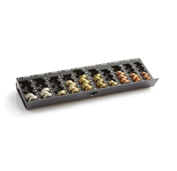 Kasseneinsatz 100 RE mit 10 herausnehmbaren Einzelmünzbehältern von 2 EURO bis 1 EURO-Cent ( 2 x 2 EURO und 2 x 1 EURO).