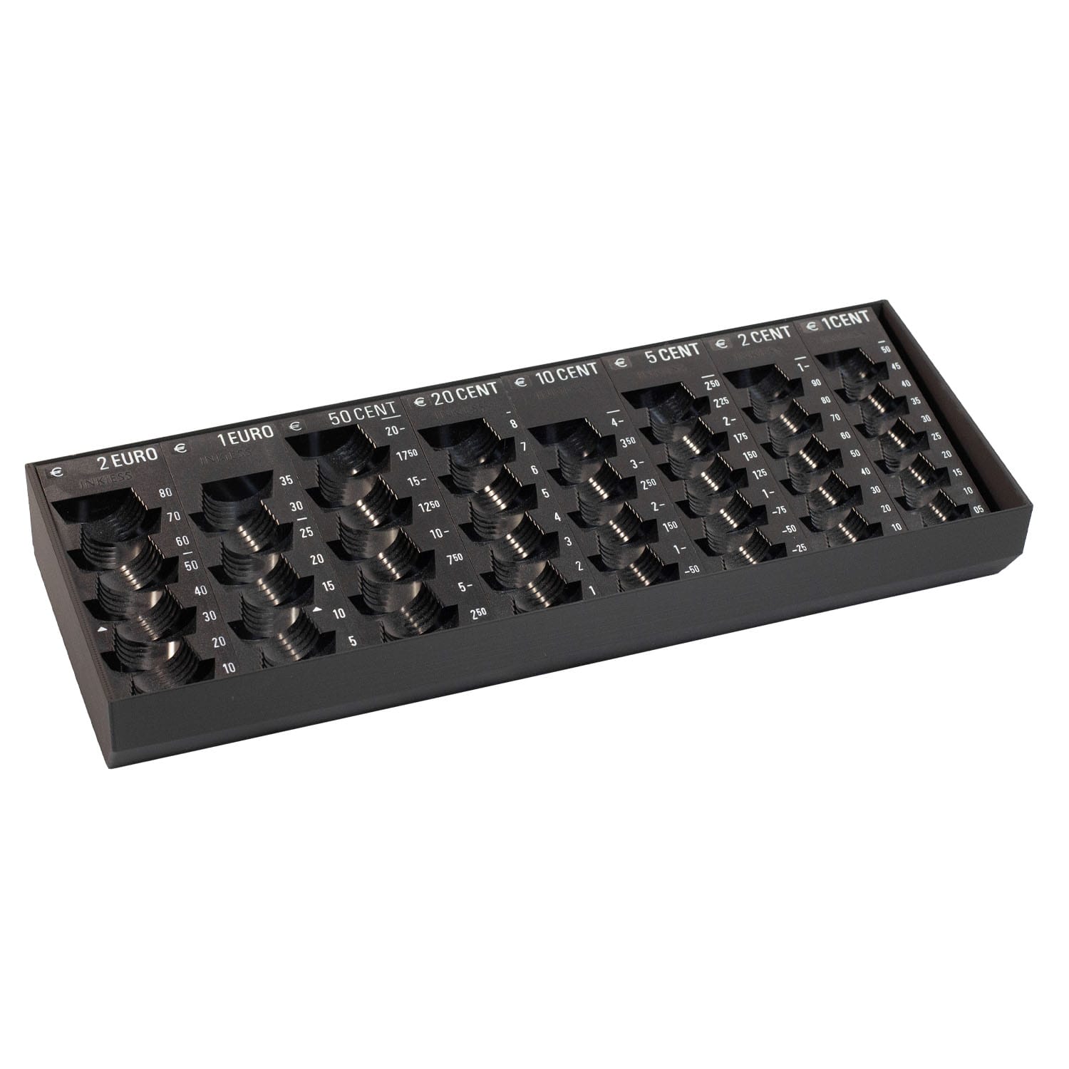 Der INKiESS Kasseneinsatz für Ihre ADASYS KL-U16 Kassenschublade mit 8 herausnehmbaren MiNiKORD Einzelmünzbehältern (Münzrillen) von 2 EURO bis 1 EURO-Cent.