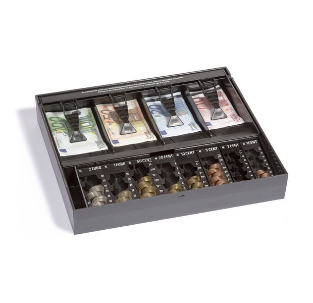 4 Banknotenfächer mit Banknotensicherungen und 1 Geldrollenfächer.