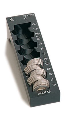 Die vertiefte Aussparung im untersten Münzfach der Einzelmünzbehälter und die gestufte seitliche Gestaltung der Münzfächer verhindert ein Umfallen der Münzen.