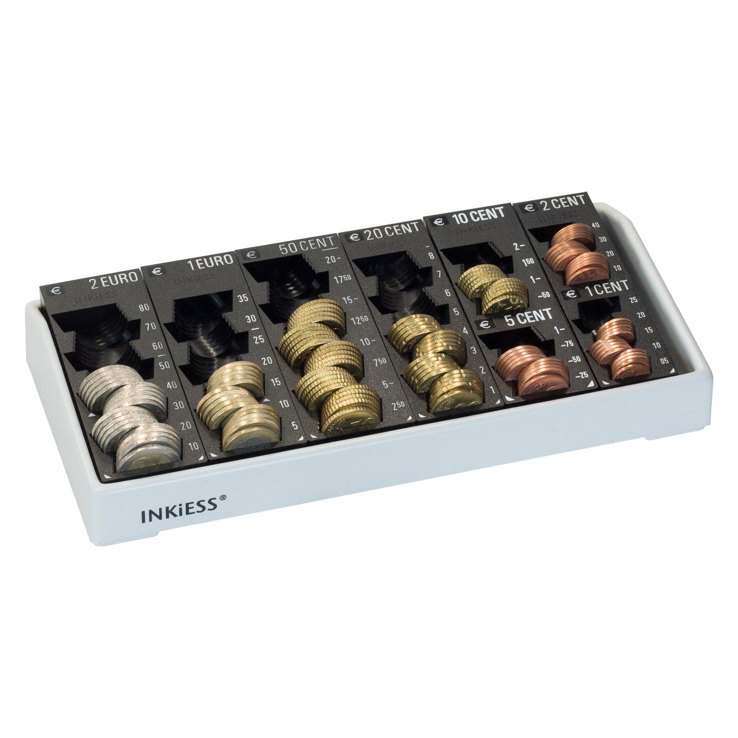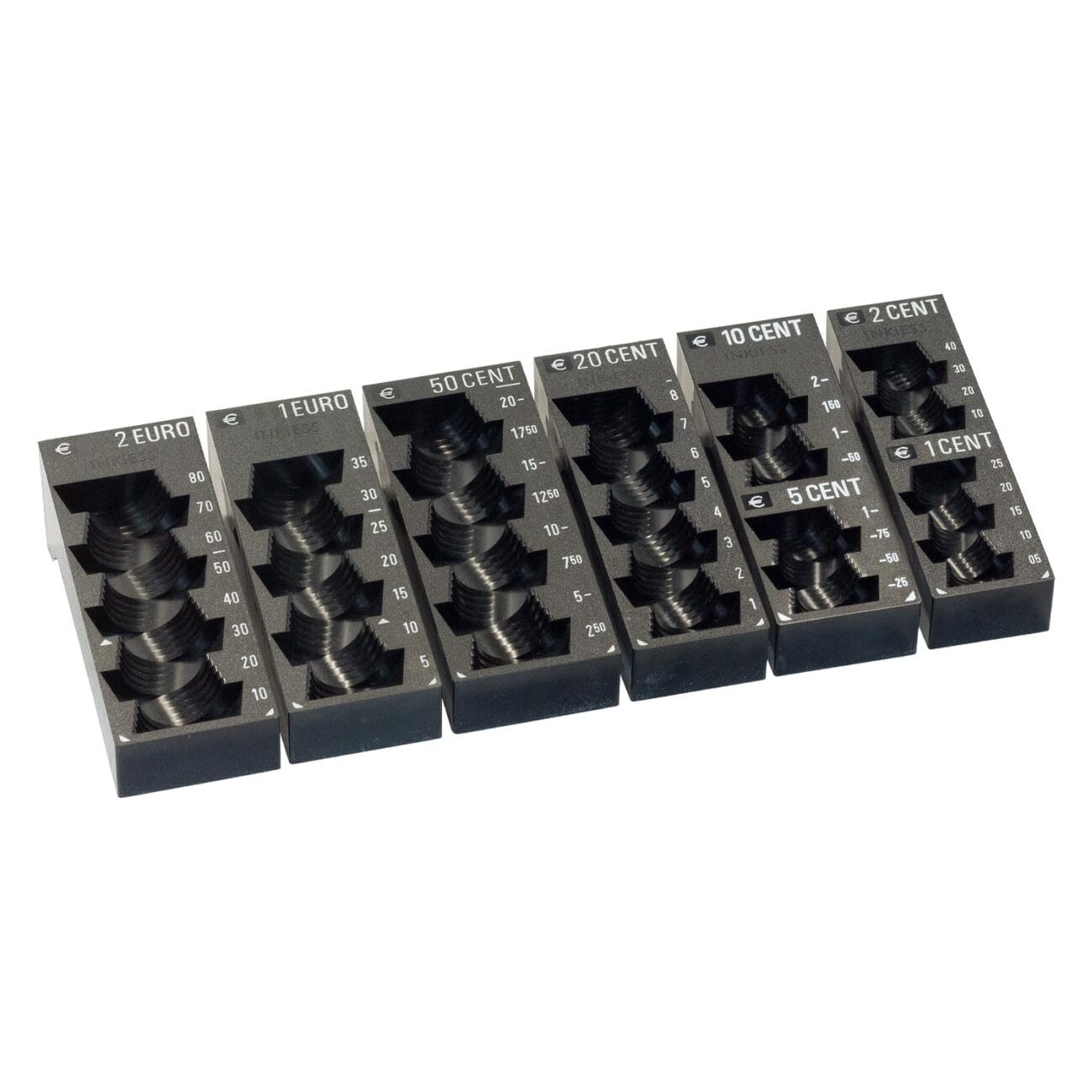 mit 6 herausnehmbaren Einzelmünzbehältern (Münzrillen) von 2 EURO bis 1 Cent (10 + 5 Cent und 2 + 1 Cent geteilt).