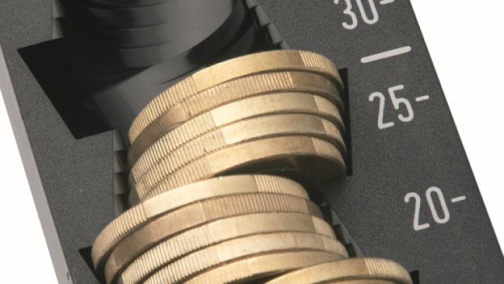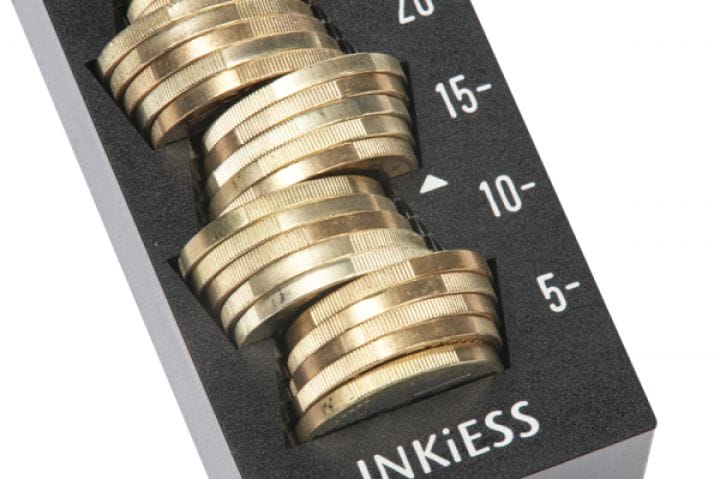 Die vertiefte Aussparung im untersten Münzfach der Einzelmünzbehälter und die gestufte seitliche Gestaltung der Münzfächer verhindert ein Umfallen der Münzen. Ein "denkender Strich" ist der bewährte Rollstrich (rechts). Er zeigt an, bei welchem Betrag eingerollt werden kann. Münzrollen können so leicht hergestellt und neu geöffnete Rollen auf Vollständigkeit überprüft werden. Dazu kommt der "zählende Pfeil" bei 2 EURO und 1 EURO Münzbehälter. Diese dreieckige Markierung (links) bezeichnet die Stelle, bei der aus einem vollständig gefüllten Münzbehälter der Inhalt einer Münzrolle von oben (hinten) zum Einrollen entnommen werden kann, ohne den restlichen Münzbestand umsortieren zu müssen.