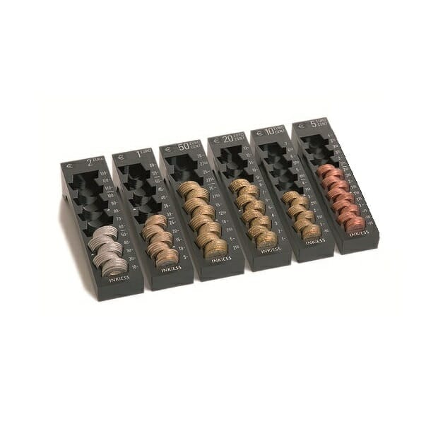 Basiselemente sind die INKiESS REKORD Einzelmünzbehälter, die es für jeden der 8 EURO-Münzwerte gibt. Die vertiefte Aussparung im untersten Münzfach der Einzelmünzbehälter und die gestufte seitliche Gestaltung der Münzfächer verhindert ein Umfallen der Münzen. Ein "denkender Strich" ist der bewährte Rollstrich (rechts). Er zeigt an, bei welchem Betrag eingerollt werden kann. Münzrollen können so leicht hergestellt und neu geöffnete Rollen auf Vollständigkeit überprüft werden. Dazu kommt der "zählende Pfeil". Diese dreieckige Markierung (links) bezeichnet die Stelle, bei der aus einem vollständig gefüllten Münzbehälter der Inhalt einer Münzrolle von oben (hinten) zum Einrollen entnommen werden kann, ohne den restlichen Münzbestand umsortieren zu müssen.