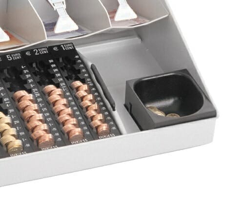Die Schreibtischkasse REKORD 8150 PL/S mit geringerer Breite für Schreibtische mit kurzem Auszug (Normalzug) mit Einzelmünzbehältern, Banknotenfächern, Banknotensicherungen, Mulde und Rollenfach. Auch für Rollcontainer geeignet.