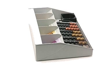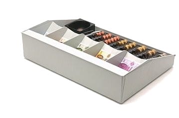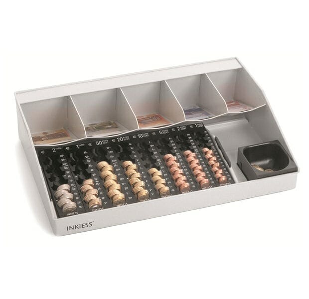 Die Schreibtischkasse REKORD 8150 PL mit geringerer Breite für Schreibtische mit kurzem Auszug (Normalzug) mit Einzelmünzbehältern, Banknotenfächern, Mulde und Rollenfach. Auch für Rollcontainer geeignet.