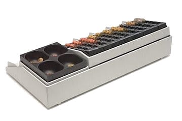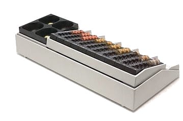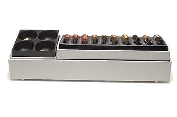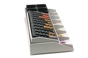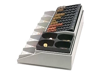 Bei der Thekenkasse 7104 PL ist genügen Raum für Bündel- und Rollengeld unter der abnehmbaren Kasse. Mit Einzelmünzbehältern, Banknotenfächern, Mulden und Rollenfach.